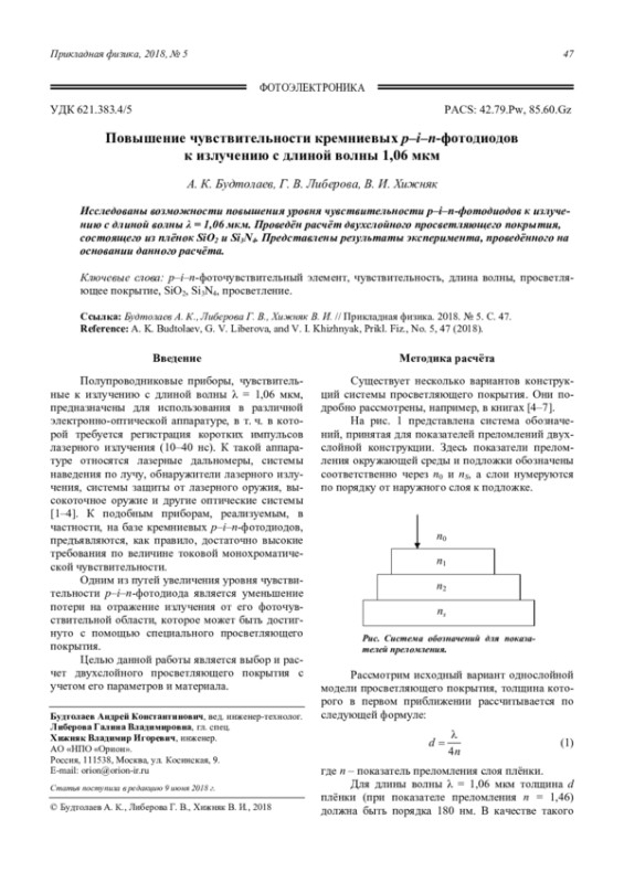 Статья: Повышение чувствительности кремниевых p–i–n-фотодиодов к излучению с длиной волны 1,06 мкм