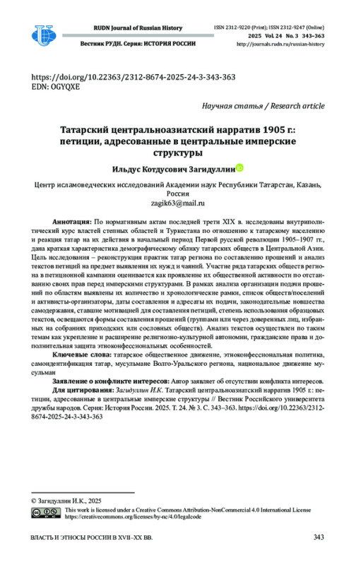 Статья: ТАТАРСКИЙ ЦЕНТРАЛЬНОАЗИАТСКИЙ НАРРАТИВ 1905 Г.: ПЕТИЦИИ, АДРЕСОВАННЫЕ В ЦЕНТРАЛЬНЫЕ ИМПЕРСКИЕ СТРУКТУРЫ