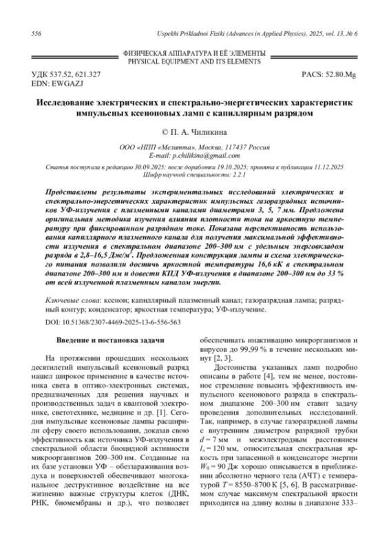 Статья: Исследование электрических и спектрально-энергетических характеристик импульсных ксеноновых ламп с капиллярным разрядом