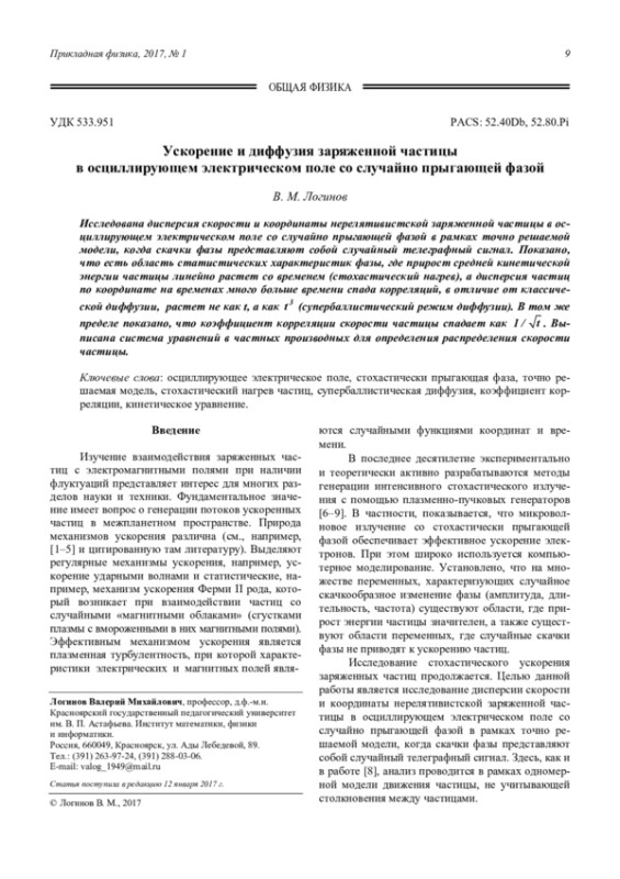 Статья: Ускорение и диффузия заряженной частицы в осциллирующем электрическом поле со случайно прыгающей фазой