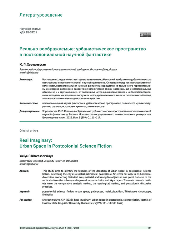 Статья: РЕАЛЬНО ВООБРАЖАЕМЫЕ: УРБАНИСТИЧЕСКОЕ ПРОСТРАНСТВО В ПОСТКОЛОНИАЛЬНОЙ НАУЧНОЙ ФАНТАСТИКЕ
