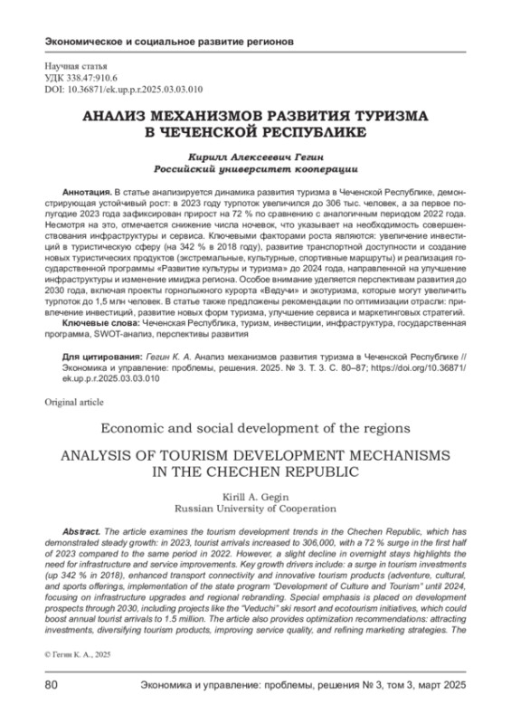 Статья: АНАЛИЗ МЕХАНИЗМОВ РАЗВИТИЯ ТУРИЗМА В ЧЕЧЕНСКОЙ РЕСПУБЛИКЕ