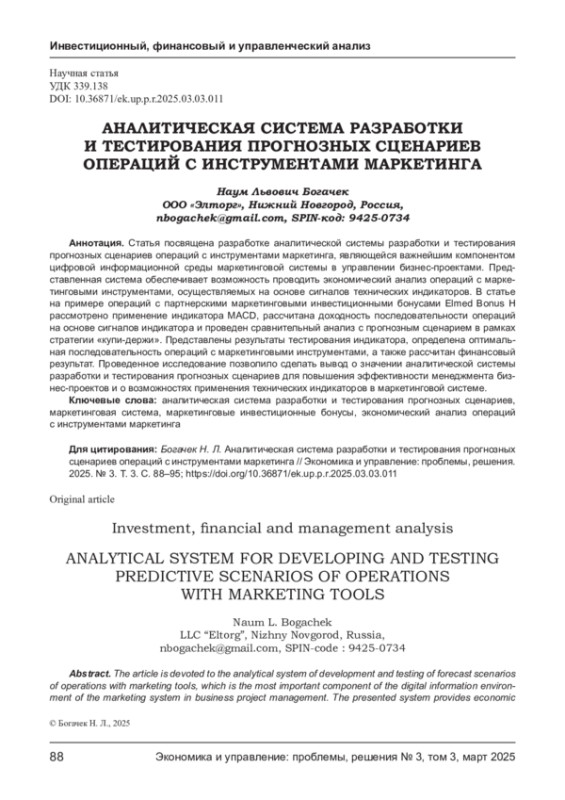 Статья посвящена разработке аналитической системы разработки и тестирования прогнозных сценариев операций с инструментами маркетинга, являющейся важнейшим компонентом цифровой информационной среды маркетинговой системы в управлении бизнес-проектами. Представленная система обеспечивает возможность проводить экономический анализ операций с маркетинговыми инструментами, осуществляемых на основе сигналов технических индикаторов. В статье на примере операций с партнерскими маркетинговыми инвестиционными бонусами Elmed Bonus H рассмотрено применение индикатора MACD, рассчитана доходность последовательности операций на основе сигналов индикатора и проведен сравнительный анализ с прогнозным сценарием в рамках стратегии «купи-держи». Представлены результаты тестирования индикатора, определена оптимальная последовательность операций с маркетинговыми инструментами, а также рассчитан финансовый результат. Проведенное исследование позволило сделать вывод о значении аналитической системы разработки и тестирования прогнозных сценариев для повышения эффективности менеджмента бизнес-проектов и о возможностях применения технических индикаторов в маркетинговой системе.