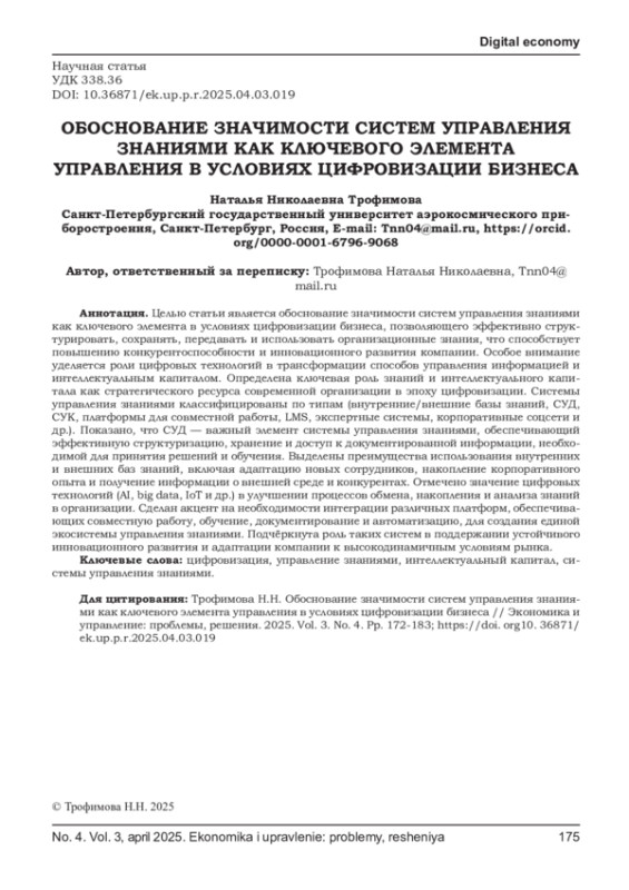 Статья: ОБОСНОВАНИЕ ЗНАЧИМОСТИ СИСТЕМ УПРАВЛЕНИЯ ЗНАНИЯМИ КАК КЛЮЧЕВОГО ЭЛЕМЕНТА УПРАВЛЕНИЯ В УСЛОВИЯХ ЦИФРОВИЗАЦИИ БИЗНЕСА
