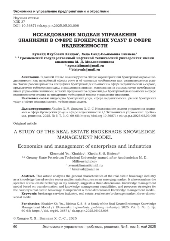 В данной статье анализируются общие характеристики брокерской отрасли недвижимости как наукоёмкой сферы услуг и её основные особенности как развивающегося рынка. Также рассматривается специфика брокерской деятельности в сфере недвижимости в стране, предлагается трёхмерная модель управления знаниями, основанная на возможностях преобразования и управления знаниями, а также предлагаются стратегии для брокерской деятельности в сфере недвижимости страны по внедрению трёхмерной модели управления знаниями.
