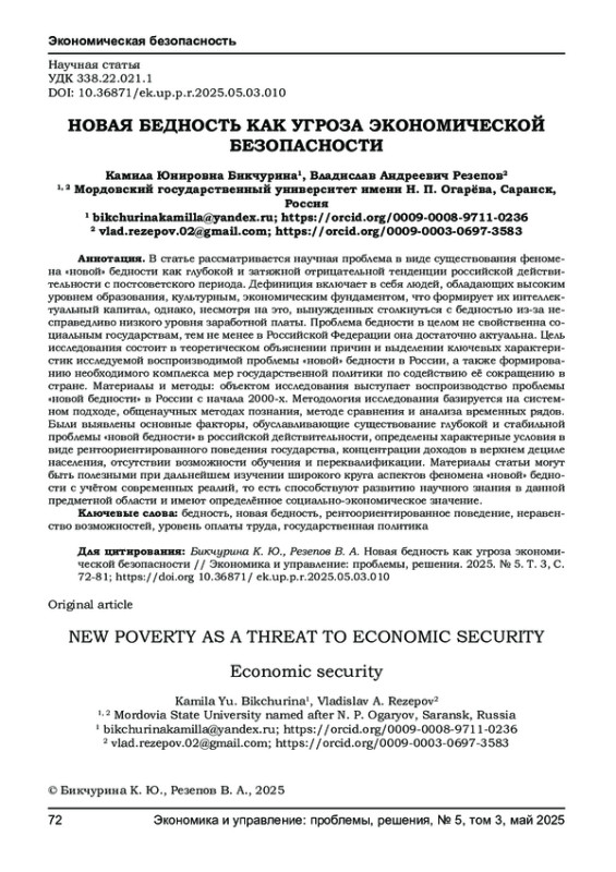 Статья: НОВАЯ БЕДНОСТЬ КАК УГРОЗА ЭКОНОМИЧЕСКОЙ БЕЗОПАСНОСТИ