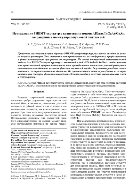 Статья: Исследование PHEMT-структур с квантовыми ямами AlGaAs/InGaAs/GaAs, выращенных молекулярно-пучковой эпитаксией