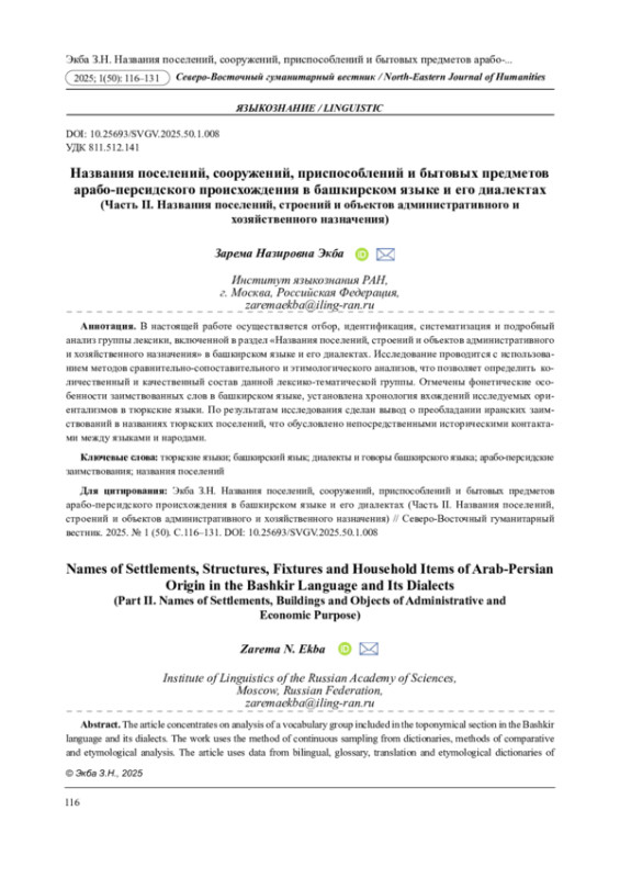 Статья: НАЗВАНИЯ ПОСЕЛЕНИЙ, СООРУЖЕНИЙ, ПРИСПОСОБЛЕНИЙ И БЫТОВЫХ ПРЕДМЕТОВ АРАБО-ПЕРСИДСКОГО ПРОИСХОЖДЕНИЯ В БАШКИРСКОМ ЯЗЫКЕ И ЕГО ДИАЛЕКТАХ (ЧАСТЬ II. НАЗВАНИЯ ПОСЕЛЕНИЙ, СТРОЕНИЙ И ОБЪЕКТОВ АДМИНИСТРАТИВНОГО И ХОЗЯЙСТВЕННОГО НАЗНАЧЕНИЯ)