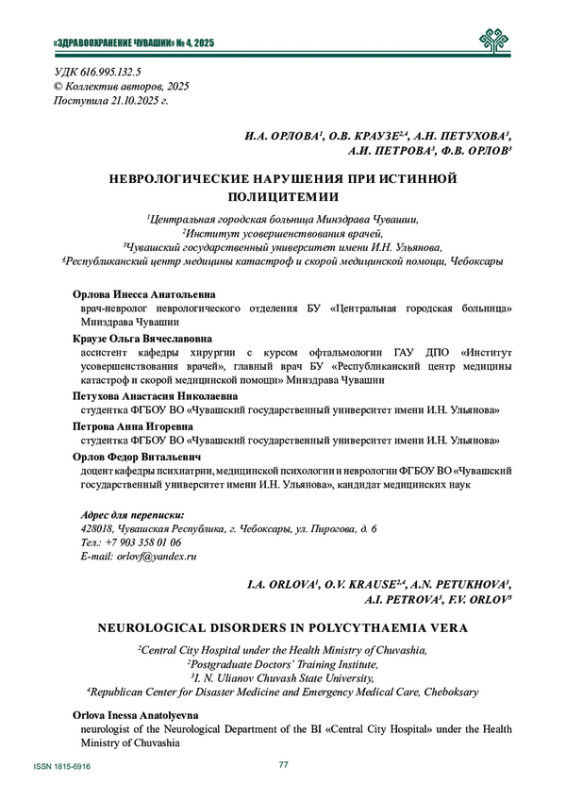 Статья: НЕВРОЛОГИЧЕСКИЕ НАРУШЕНИЯ ПРИ ИСТИННОЙ ПОЛИЦИТЕМИИ