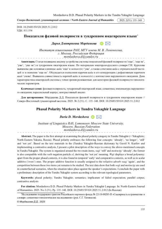 Статья: ПОКАЗАТЕЛИ ФАЗОВОЙ ПОЛЯРНОСТИ В ТУНДРЕННОМ ЮКАГИРСКОМ ЯЗЫКЕ
