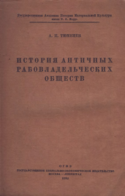 «История античных рабовладельческих обществ» А. И. Тюменева представляет собой очерк возникновения, развития и крушения рабовладельческих обществ древней Греции, эллинистического Востока и Рима и предназначена для широких кругов советских читателей.