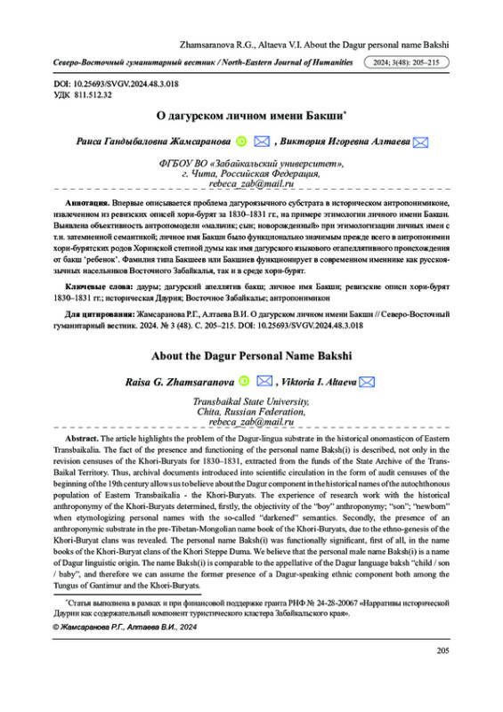 Впервые описывается проблема дагуроязычного субстрата в историческом антропонимиконе, извлеченном из ревизских описей хори-бурят за 1830-1831 гг., на примере этимологии личного имени Бакши. Выявлена объективность антропомодели «мальчик; сын; новорожденный» при этимологизации личных имен с т. н. затемненной семантикой; личное имя Бакши было функционально значимым прежде всего в антропонимии хори-бурятских родов Хоринской степной думы как имя дагурского языкового отапеллятивного происхождения от бакш ʻребенокʼ. Фамилия типа Бакшеев или Бакшиев функционирует в современном именнике как русскоязычных насельников Восточного Забайкалья, так и в среде хори-бурят.