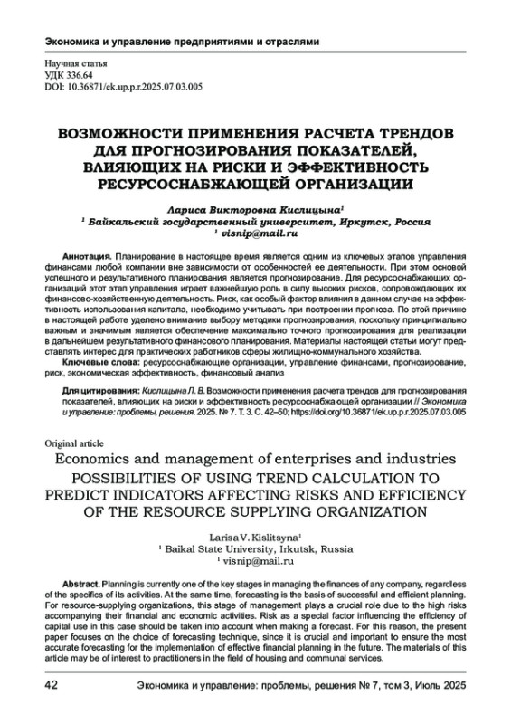 Статья: ВОЗМОЖНОСТИ ПРИМЕНЕНИЯ РАСЧЕТА ТРЕНДОВ ДЛЯ ПРОГНОЗИРОВАНИЯ ПОКАЗАТЕЛЕЙ, ВЛИЯЮЩИХ НА РИСКИ И ЭФФЕКТИВНОСТЬ РЕСУРСОСНАБЖАЮЩЕЙ ОРГАНИЗАЦИИ