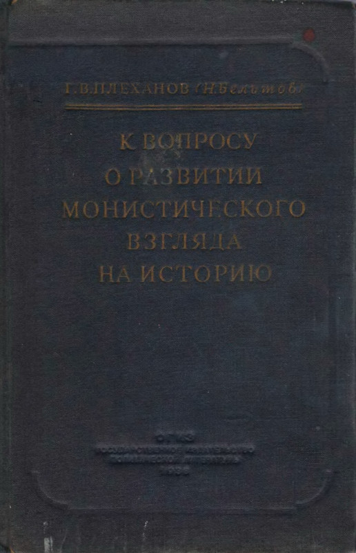 Книга Г. В. Плеханова «К вопросу о развитии монистического взгляда на историю» написана в 1894 г. и вышла первым изданием под псевдонимом Н. Бельтова в Петербурге в 1895 г. Условия царской цензуры сделали необходимым для Плеханова дать книге, как он говорил впоследствии, «это печальное и неуклюжее имя».