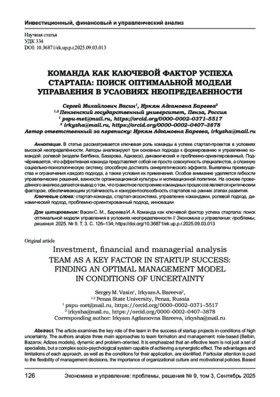 Статья: КОМАНДА КАК КЛЮЧЕВОЙ ФАКТОР УСПЕХА СТАРТАПА: ПОИСК ОПТИМАЛЬНОЙ МОДЕЛИ УПРАВЛЕНИЯ В УСЛОВИЯХ НЕОПРЕДЕЛЕННОСТИ