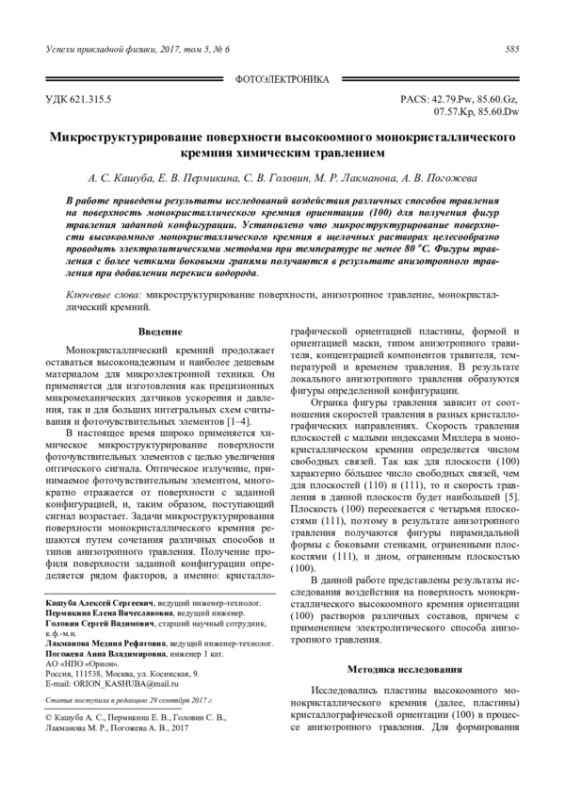 Статья: Микроструктурирование поверхности высокоомного монокристаллического кремния химическим травлением