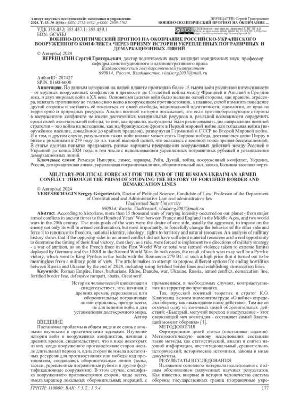 Статья: ВОЕННО-ПОЛИТИЧЕСКИЙ ПРОГНОЗ НА ОКОНЧАНИЕ РОССИЙСКО-УКРАИНСКОГО ВООРУЖЕННОГО КОНФЛИКТА ЧЕРЕЗ ПРИЗМУ ИСТОРИИ УКРЕПЛЕННЫХ ПОГРАНИЧНЫХ И ДЕМАРКАЦИОННЫХ ЛИНИЙ