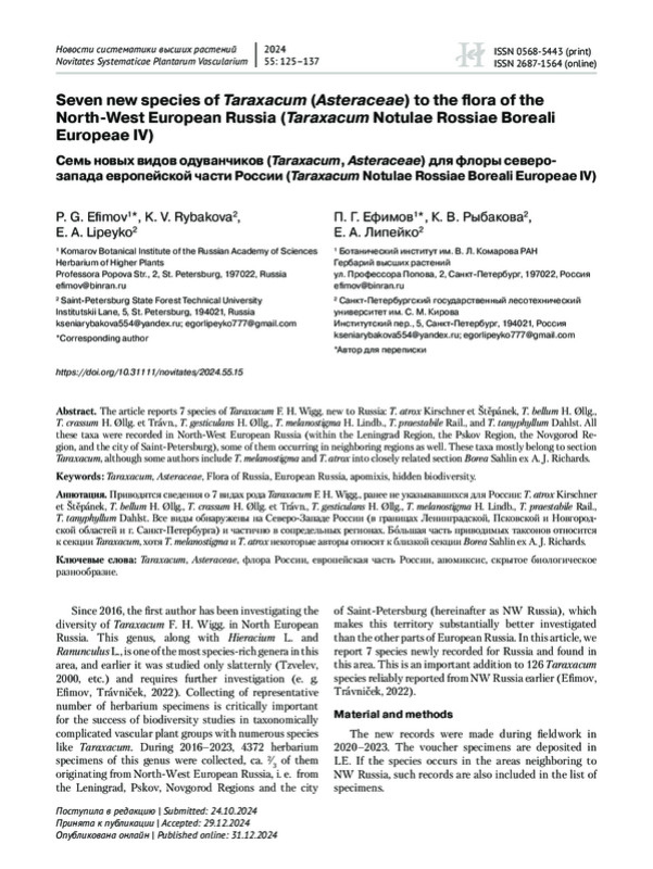 Статья: Семь новых видов одуванчиков (Taraxacum, Asteraceae) для флоры северозапада европейской части России (Taraxacum Notulae Rossiae Boreali Europeae IV)