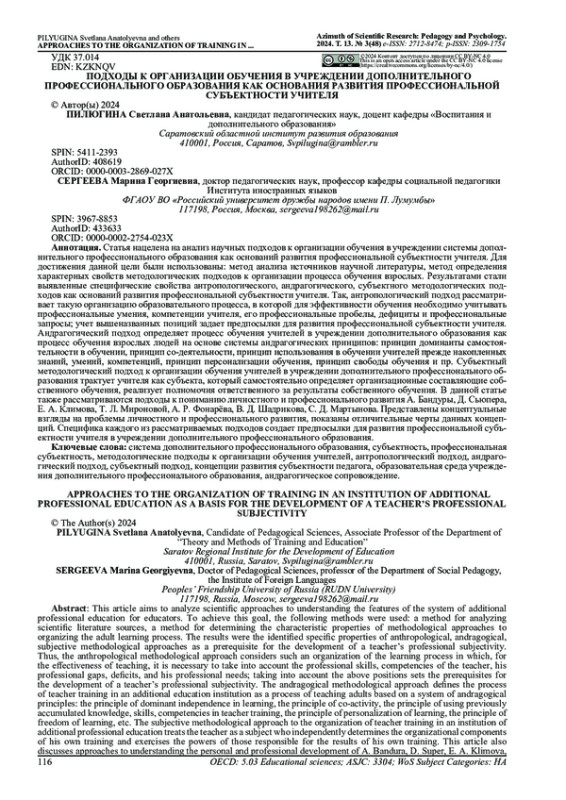 Статья нацелена на анализ научных подходов к организации обучения в учреждении системы дополнительного профессионального образования как оснований развития профессиональной субъектности учителя. Для достижения данной цели были использованы: метод анализа источников научной литературы, метод определения характерных свойств методологических подходов к организации процесса обучения взрослых. Результатами стали выявленные специфические свойства антропологического, андрагогического, субъектного методологических подходов как оснований развития профессиональной субъектности учителя. Так, антропологический подход рассматривает такую организацию образовательного процесса, в которой для эффективности обучения необходимо учитывать профессиональные умения, компетенции учителя, его профессиональные пробелы, дефициты и профессиональные запросы; учет вышеназванных позиций задает предпосылки для развития профессиональной субъектности учителя. Андрагогический подход определяет процесс обучения учителей в учреждении дополнительного образования как процесс обучения взрослых людей на основе системы андрагогических принципов: принцип доминанты самостоятельности в обучении, принцип со-деятельности, принцип использования в обучении учителей прежде накопленных знаний, умений, компетенций, принцип персонализации обучения, принцип свободы обучения и пр. Субъектный методологический подход к организации обучения учителей в учреждении дополнительного профессионального образования трактует учителя как субъекта, который самостоятельно определяет организационные составляющие собственного обучения, реализует полномочия ответственного за результаты собственного обучения. В данной статье также рассматриваются подходы к пониманию личностного и профессионального развития А. Бандуры, Д. Сьюпера, Е. А. Климова, Т. Л. Мироновой, А. Р. Фонарёва, В. Д. Шадрикова, С. Д. Мартынова. Представлены концептуальные взгляды на проблемы личностного и профессионального развития, показаны отличительные черты данных концепций. Специфика каждого из рассматриваемых подходов создает предпосылки для развития профессиональной субъектности учителя в учреждении дополнительного профессионального образования.