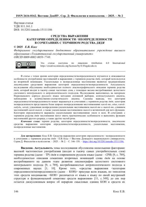 Статья: СРЕДСТВА ВЫРАЖЕНИЯ КАТЕГОРИИ ОПРЕДЕЛЕННОСТИ / НЕОПРЕДЕЛЕННОСТИ В СОЧЕТАНИЯХ С ТЕРМИНОМ РОДСТВА ДЯДЯ