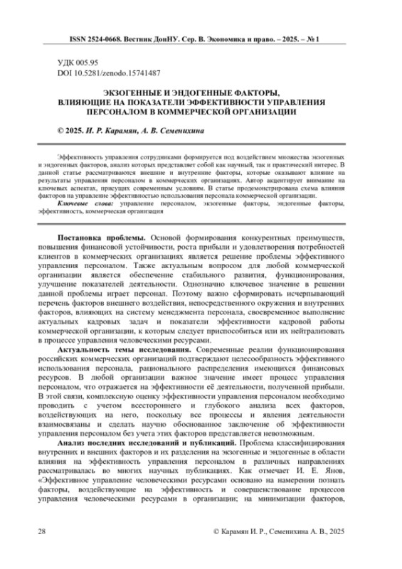 Статья: ЭКЗОГЕННЫЕ И ЭНДОГЕННЫЕ ФАКТОРЫ, ВЛИЯЮЩИЕ НА ПОКАЗАТЕЛИ ЭФФЕКТИВНОСТИ УПРАВЛЕНИЯ ПЕРСОНАЛОМ В КОММЕРЧЕСКОЙ ОРГАНИЗАЦИИ