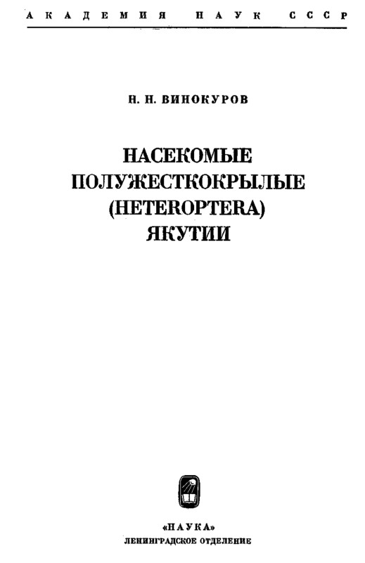 Академическое издание «Насекомые полужесткокрылые (Heteroptera) Якутии» (1979), Н. Н. Винокуров, из серии изданий «Определители по фауне». Издание содержит краткие описания насекомых данного региона, определительные таблицы, термины, схемы и рисунки. Материалы книги будут полезны профессиональным энтомологам, студентам-биологам и натуралистам.
