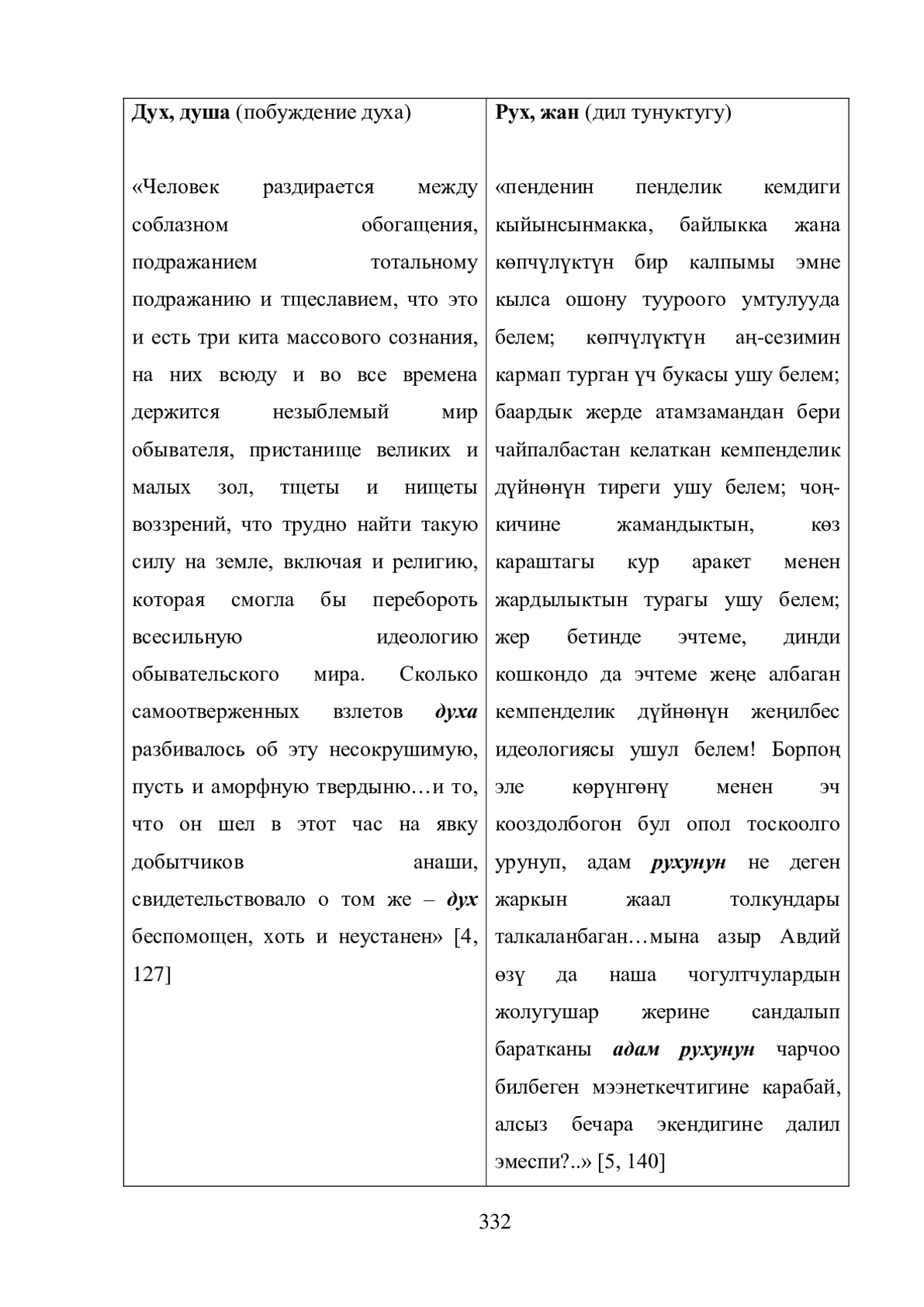 6. Специфический стилевой пласт, связанный с определенной сферой употребления (в частности, из областей науки, религии, техники, журналистики) тех или иных лексических единиц, также не позволил М. Толомушеву прибегать к их вольной интерпретации, хотя в ряде случаев мы наблюдаем довольно интересные переводческие решения в аспекте воздания стилистических средств оригинала, в том числе идиоматики. Подход М. Толомушева нам представляется оправданным и, несмотря на то, что местами граничит с буквализмом, дает положительный переводческий результат: М. Толомушеву удалось, на наш взгляд, адекватно передать на кыргызском языке авторскую концепцию и особенности стилистики произведения.