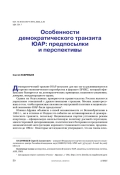 В статье обобщены основные характеристики модели демократического транзита ЮАР на основе вторичного анализа научных статей, отчётов социально-политических исследовательских центров, а также результатов эмпирического исследования. Автор предпринял попытку ответить на вопросы: что обусловило демократический транзит ЮАР; что означает демократия для южноафриканцев; почему пробуксовывает модернизационный процесс в настоящее время и каковы его перспективы?
