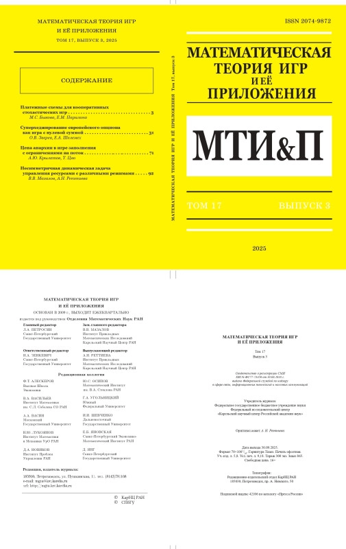 В статье задача суперхеджирования европейского опциона отождествляется с динамической стохастической игрой с нулевой суммой между рынком и продавцом контракта. Продавец управляет портфелем базовых активов, стремясь минимизировать свой ожидаемый экспоненциальный риск. Рынок же задает распределение вероятностей дисконтированных цен обращающихся на нем активов: абсолютно непрерывное относительно заданного базового распределения и максимизирующее ожидаемый риск продавца. Получены рекуррентные соотношения для верхней и нижней цен игры. Показано, что отсутствие на рынке арбитражных возможностей является необходимым и достаточным условием существования самофинансируемого портфеля, на котором достигается нижняя грань в определении верхней цены игры. Такой портфель является суперхеджирующим, а верхняя цена игры позволяет вычислить верхнюю цену хеджирования. Кроме того, показано, что в модели рынка без арбитражных возможностей всегда имеет место игровое равновесие. Седловая точка игры, если она существует, определяет суперхеджирующий портфель и мартингальное распределений вероятностей, доставляющее верхнюю грань в определении верхней цены игры. Это распределение задает <<наихудший>> для продавца рынок в том смысле, что резерв суперхеджирующего портфеля на нем расходуется полностью. На примерах проведено сравнение результатов расчета опциона на основе вероятностного и потраекторного игровых подходов, проанализированы достоинства и недостатки выбора топологии σ(L1, L∞) и слабой топологии в вероятностной постановке задач этого типа.