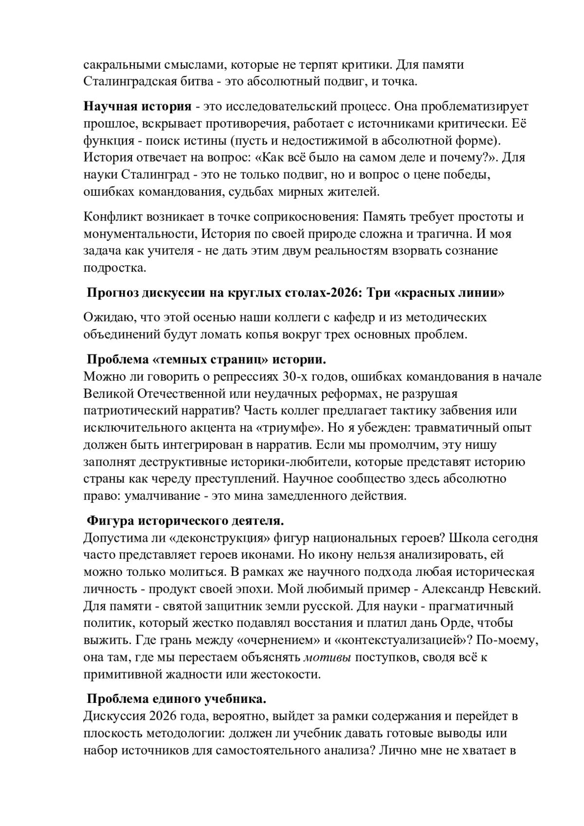 В преддверии осенних круглых столов 2026 года, организованных ведущими педагогическими и историческими факультетами, дискуссии вокруг школьного исторического образования достигают нового уровня напряжения. Ключевой антиномией становится противоречие между исторической памятью как инструментом гражданской идентичности и научной историей как методом поиска истины. В статье предпринята попытка деконструировать эту дихотомию и предложить концептуальные рамки для поиска баланса в школе, основанные на возрастном подходе и развитии критического мышления.