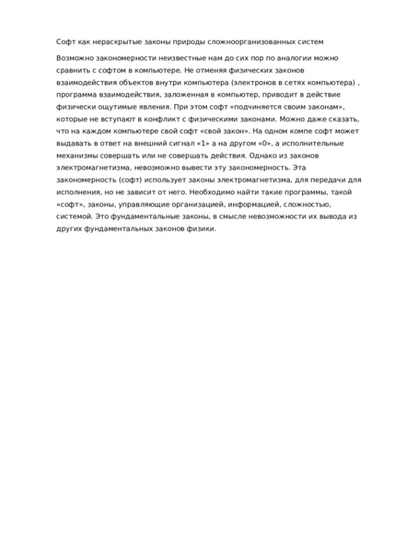 Возможно закономерности неизвестные нам до сих пор по аналогии можно сравнить с софтом в компьютере. Не отменяя физических законов взаимодействия объектов внутри компьютера (электронов в сетях компьютера) , программа взаимодействия заложенная в компьютер приводит в действие физически ощутимые явления. При этом софт «подчиняется своим законам», которые не вступают в конфликт с физическими законами. Можно даже сказать , что на каждом компьютере свой софт «свой закон». На одном компе софт может выдавать в ответ на внешний сигнал «1» а на другом «0», а исполнительные механизмы совершать или не совершать действия. Однако из законов электромагнетизма, невозможно вывести эту закономерность. Эта закономерность (софт) использует законы электромагнетизма, для передачи для исполнения, но не зависит от него. Необходимо найти такие программы, такой софт, законы, управляющие организацией, информацией, сложностью, системой. Это фундаментальные законы, в смысле невозможности их вывода из других фундаментальных законов физики.