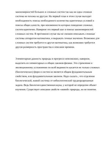 Элементарная данность природы в прогрессе невозможно наверное выделить из элементарных и общих законов физики. Это стремление к эволюционному усложнению по всей видимости касается не только сложных (биологических) форм и систем но является общим фундаментальным свойством, или фундаментальным законом. Надо сказать , что отделение биологической, живой системы от небиологической трудноразрешимая задача. Ведь биология единственная наука, у которой не определен объект изучения. Существует описание свойств «живой» природы, но не понятие.