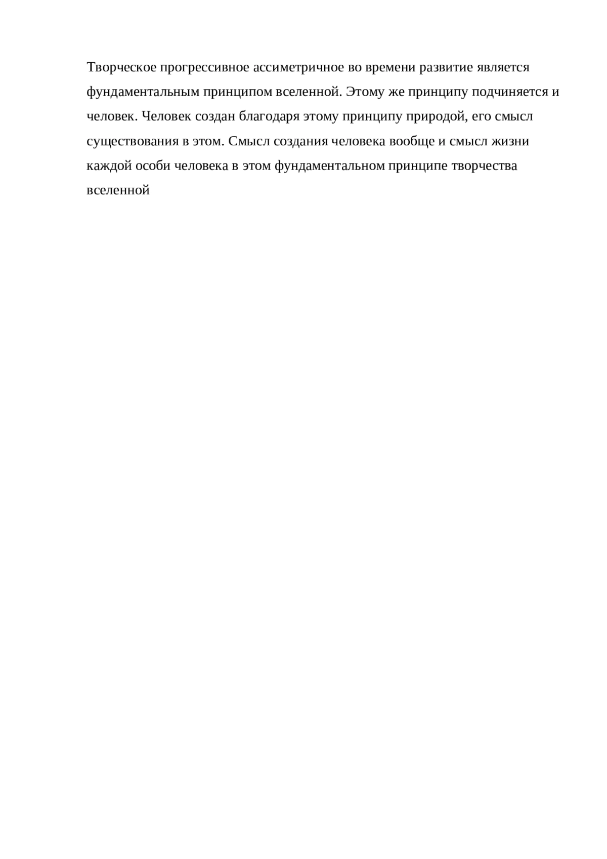 Творческое прогрессивное ассиметричное во времени развитие является фундаментальным принципом вселенной. Этому же принципу подчиняется и человек. Человек создан благодаря этому принципу природой, его смысл существования в этом. Смысл создания человека вообще и смысл жизни каждой особи человека в этом фундаментальном принципе творчества вселенной