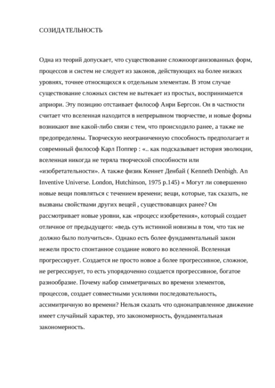 Одна из теорий допускает, что существование сложноорганизованных форм, процессов и систем не следует из законов, действующих на более низких уровнях, точнее относящихся к отдельным элементам. В этом случае существование сложных систем не вытекает из простых, воспринимается априори. Эту позицию отстаивает философ Анри Бергсон. Он в частности считает что вселенная находится в непрерывном творчестве, и новые формы возникают вне какой-либо связи с тем, что происходило ранее, а также не предопределены. Творческую неограниченную способность предполагает и совремнный философ Карл Поппер : «.. как подсказывает история эволюции, вселенная никогда не теряла творческой способности или «изобретательности». А также физик Кеннет Денбай ( Kenneth Denbigh. An Inventive Universe. London, Hutchinson, 1975 p.145) « Могут ли совершенно новые вещи появляться с течением времени; вещи, которые, так сказать, не вызваны свойствами других вещей , существовавщих ранее? Он рассмотривает новые уровни, как «процесс изобретения», который создает отличное от предыдущего: «ведь суть истинной новизны в том, что так не должно было получиться». Однако есть более фундаментальный закон нежели просто спонтанное создание нового во вселенной. Вселенная прогрессирует. Создается не просто новое а более прогрессивное, сложное, не регрессирует, то есть упорядоченно создается прогрессивное, богатое разнообразие. Почему набор симметричных во времени элементов, процессов, создает совместными усилиями последовательность, ассимитричную во времени? Нельзя сказать что однонаправленное движение имеет случайный характер, это закономерность, фундаментальная закономерность.