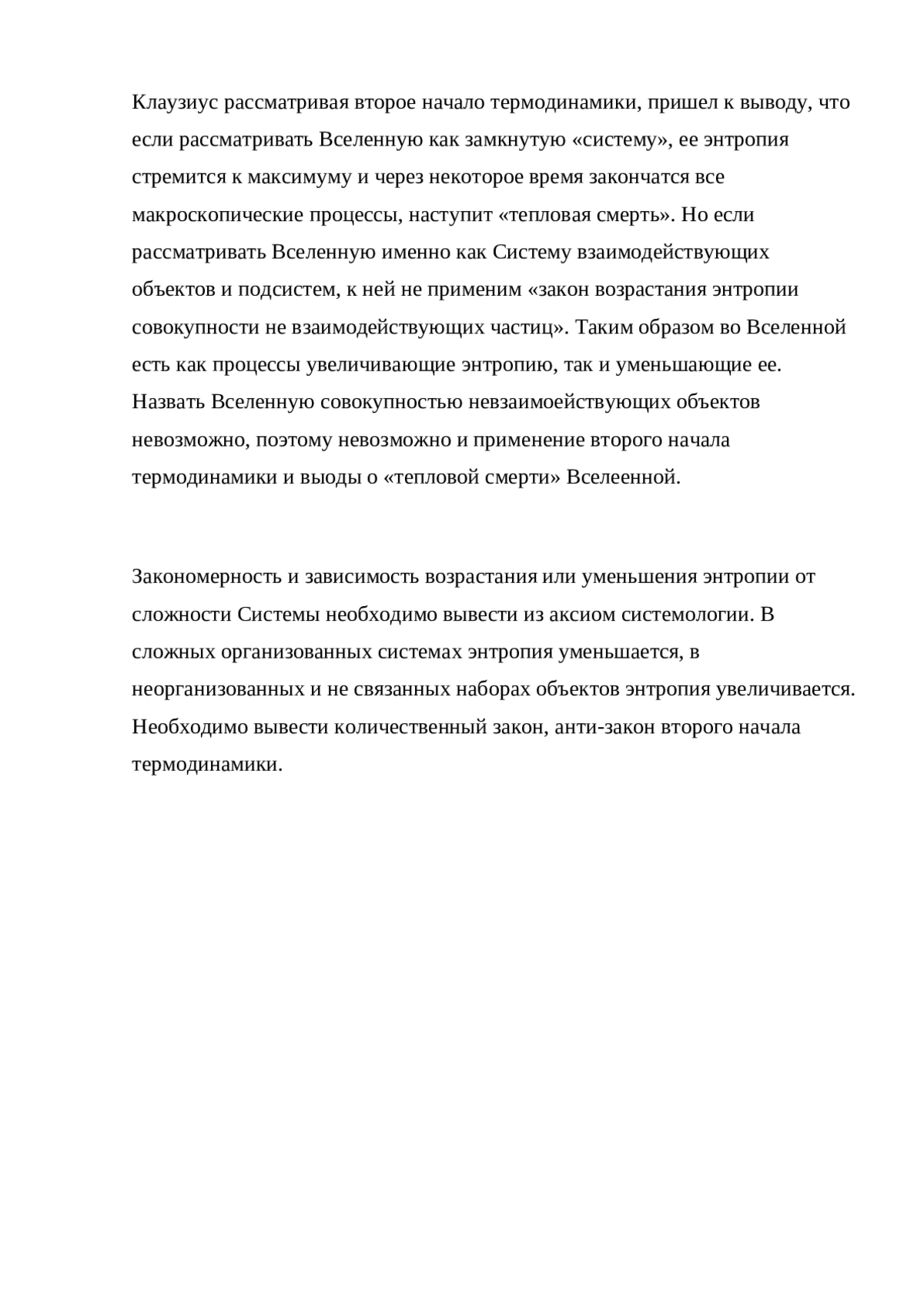 Клаузиус рассматривая второе начало термодинамики, пришел к выводу, что если рассматривать Вселенную как замкнутую «систему», ее энтропия стремится к максимуму и через некоторое время закончатся все макроскопические процессы, наступит «тепловая смерть». Но если рассматривать Вселенную именно как Систему взаимодействующих объектов и подсистем, к ней не применим «закон возрастания энтропии совокупности не взаимодействующих частиц». Таким образом во Вселенной есть как процессы увеличивающие энтропию, так и уменьшающие ее. Назвать Вселенную совокупностью невзаимоействующих объектов невозможно, поэтому невозможно и применение второго начала термодинамики и выоды о «тепловой смерти» Вселеенной.