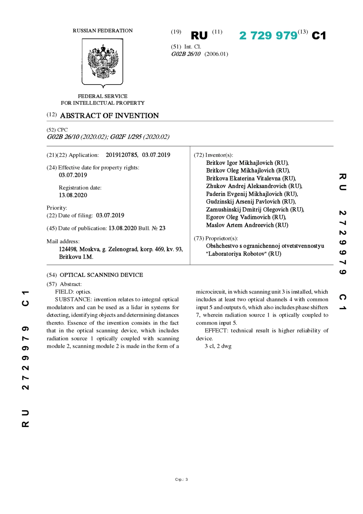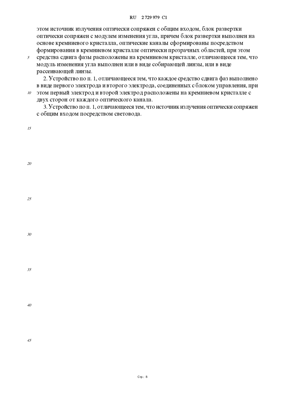 1. Устройство для оптического сканирования, включающее источник излучения, оптически сопряженный с модулем сканирования, который выполнен в виде микросхемы и в который установлен блок развертки, включающий, по меньшей мере, два оптических канала с общим входом и выходами, включающий также средства сдвига фазы, при Стр.: 7RU 2729979 C1 5 10 15 20 25 30 35 40 45 этом источник излучения оптически сопряжен с общим входом, блок развертки оптически сопряжен с модулем изменения угла, причем блок развертки выполнен на основе кремниевого кристалла, оптические каналы сформированы посредством формирования в кремниевом кристалле оптически прозрачных областей, при этом средства сдвига фазы расположены на кремниевом кристалле, отличающееся тем, что модуль изменения угла выполнен или в виде собирающей линзы, или в виде рассеивающей линзы.
