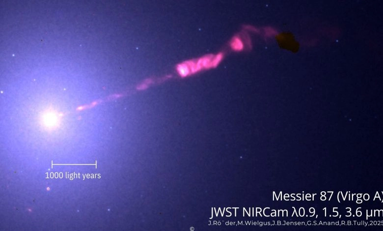 Космический телескоп «Джеймс Уэбб» получил самое четкое на сегодняшний день изображение в инфракрасном диапазоне релятивистской струи, выброшенной сверхмассивной черной дырой в центре галактики M87. Эта струя, которая изучается астрономами на протяжении более ста лет, на новом снимке предстала в виде светящейся розовой ленты, протянувшейся на несколько тысяч световых лет от черной дыры на фоне туманного фиолетового свечения. Уникальность полученных данных заключается в том, что впервые в инфракрасном свете удалось зафиксировать слабую контрструю, удаляющуюся от черной дыры в противоположном направлении на расстоянии около 6000 световых лет.