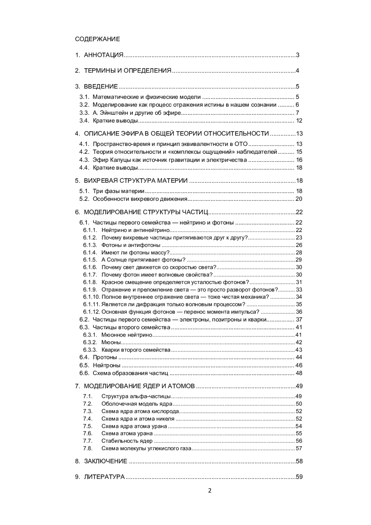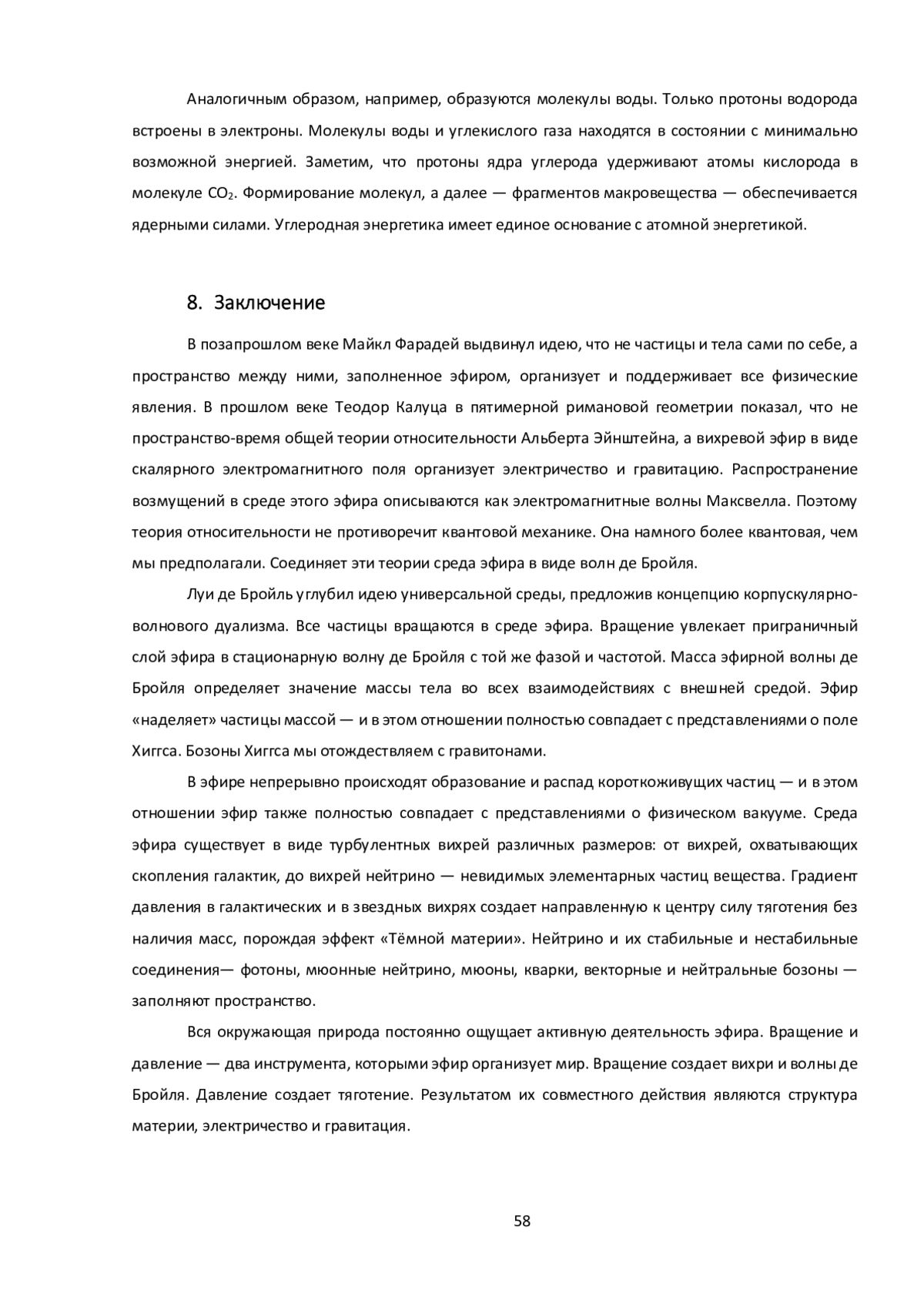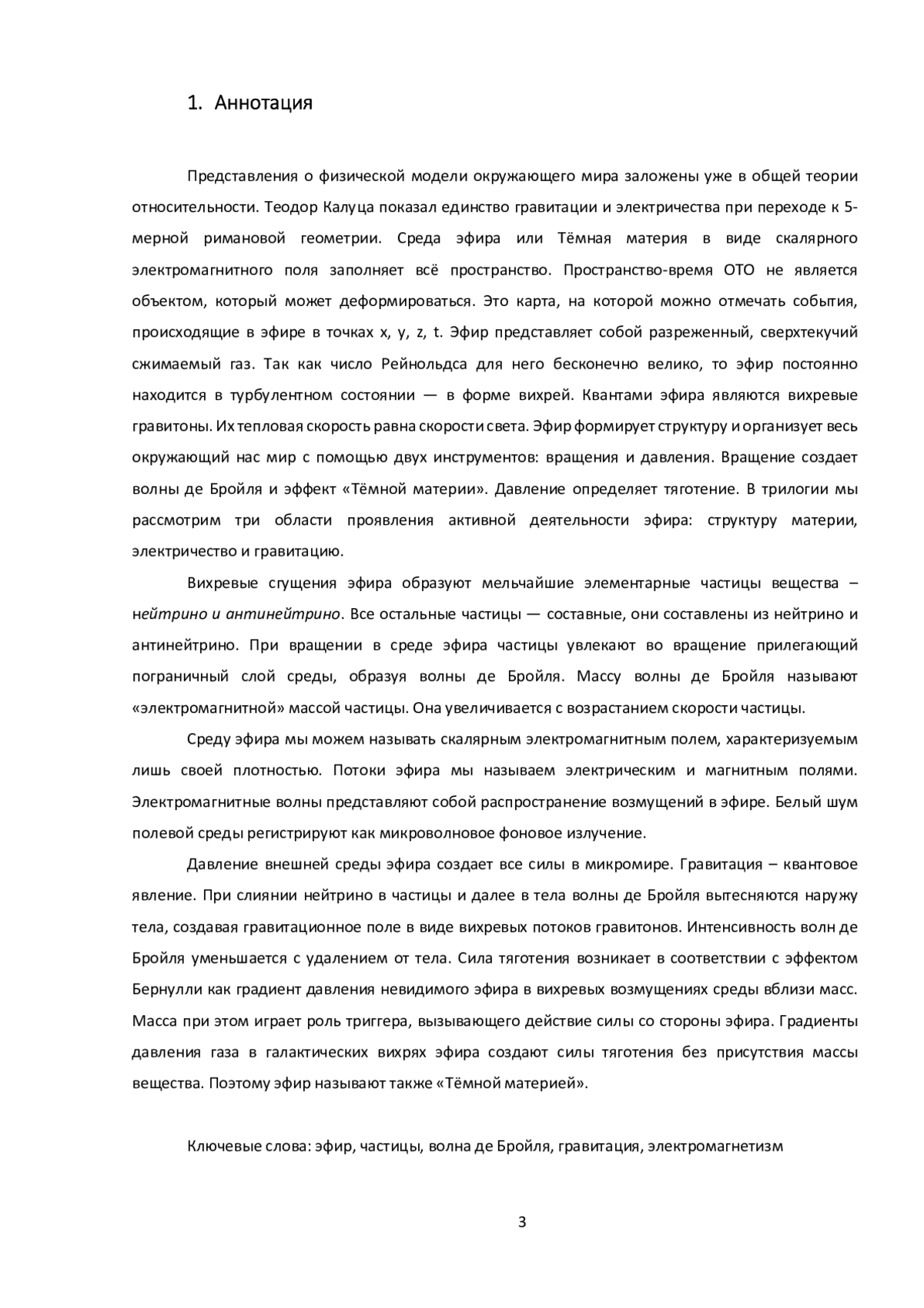 Представления о физической модели окружающего мира заложены уже в общей теории относительности. Теодор Калуца показал единство гравитации и электричества при переходе к 5-мерной римановой геометрии. Среда эфира или Тёмная материя в виде скалярного электромагнитного поля заполняет всё пространство. Пространство-время ОТО не является объектом, который может деформироваться. Это карта, на которой можно отмечать события, происходящие в эфире в точках x, y, z, t. Эфир представляет собой разреженный, сверхтекучий сжимаемый газ. Так как число Рейнольдса для него бесконечно велико, то эфир постоянно находится в турбулентном состоянии — в форме вихрей. Квантами эфира являются вихревые гравитоны. Их тепловая скорость равна скорости света. Эфир формирует структуру и организует весь окружающий нас мир с помощью двух инструментов: вращения и давления. Вращение создает волны де Бройля и эффект «Тёмной материи». Давление определяет тяготение.