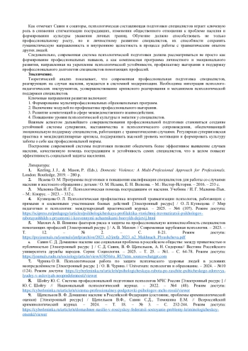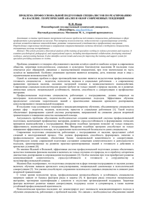 В статье представлен теоретический анализ проблемы подготовки специалистов, работающих в сфере профилактики и реагирования на насилие. Рассмотрены психологические, педагогические и организационные аспекты, включая межведомственное взаимодействие, развитие эмоциональной устойчивости и профилактику выгорания. Определённые современные тенденции и направления совершенствования системы обучения и поддержки специалистов, оказывающих помощь пострадавшим.