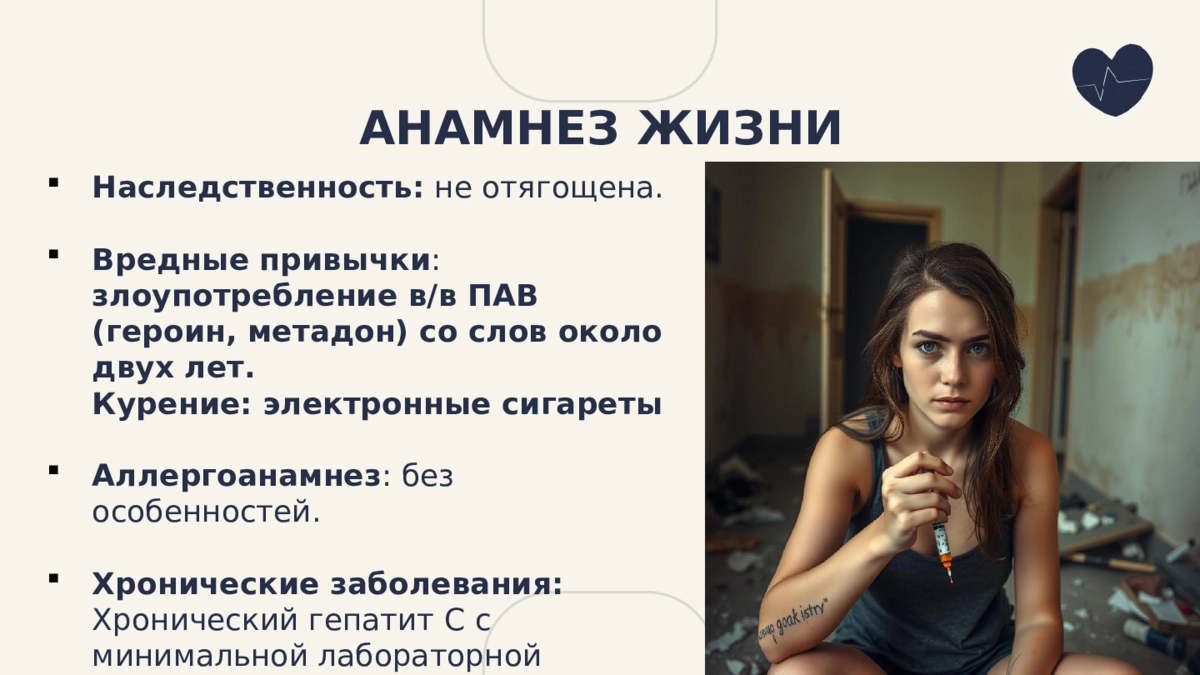 В данной презентации представлен очень интересный и редкий по своей особенности клинический случай по пациентке, которая длительное время страдала наркоманией, получила тяжелое осложнение в виде деструктивной пневмонии, а также инфекционный эндокардит трикуспидального клапана.