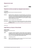 Исследуется законность и эффективность в политической деятельности, а также сущность правовой политики. На данном уровне развития социальной культуры эффективность доминирует над законностью, что делает проблематичным формирование устойчивого правового политического феномена. Одним из этапов его формирования является правовое государство. Принципы правовой государственности постепенно утверждаются в мире, что нелинейно, но позитивно отражается на декриминализации социума.
