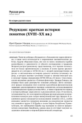 Понятие редукции обсуждается в большинстве курсов фонетики, а также часто используется в современных лингвистических работах. Будучи общеизвестным, оно тем не менее понимается к райне разнообразно в зависимости от области исследования и традиции. Вопреки распространенному представлению, этот термин используется не только применительно к гласным. В статье кратко рассматривается его история в XVIII–XX вв. С опорой преимущественно на русско- и англоязычные источники делается попытка установить период, в котором явление устойчиво входит в лингвистический узус и получает первые определения (XVIII–XIX вв.). В связи с этим специальное внимание уделяется «Основам фонетики» Эдуарда Зиверса, где впервые было дано развернутое описание редукции. Затем описывается процесс вхождения этого понятия в российскую филологическую традицию: рассматриваются термины-заменители, использовавшиеся в языковедческих трудах до конца XIX в., а также определяется период, в котором редукция закрепляется в русскоязычном узусе. В частности, устанавливается, что в восприятии редукции русскоязычными исследователями немалую роль сыграл вышеупомянутый труд Зиверса. В заключение кратко описывается использование понятия в XX в.; особое внимание уделяется смещению внимания на вокалические процессы под влиянием трудов Л. В. Щербы и позже Бьёрна Линдблома. Примечательно, что наблюдения Щербы над гласными во многом предвосхитили концепцию Линдблома, однако едва ли этот факт получил заслуженное внимание в мировой фонетической литературе.